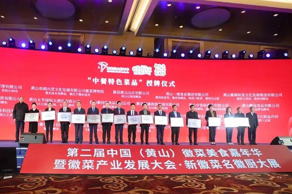 大會現(xiàn)場,依次對2022年度黃山名廚、徽菜行業(yè)領(lǐng)軍人物、十大徽菜名店和徽菜食材生產(chǎn)基地進行了授牌、頒證。其中黃山全江生態(tài)農(nóng)業(yè)科技有限公司榮獲“2022年度十大徽菜食材生產(chǎn)基地”稱號,董事長江禮明上臺接受授牌。同時,全江刀板香和土香腸分別被列入中餐特色菜品名錄。