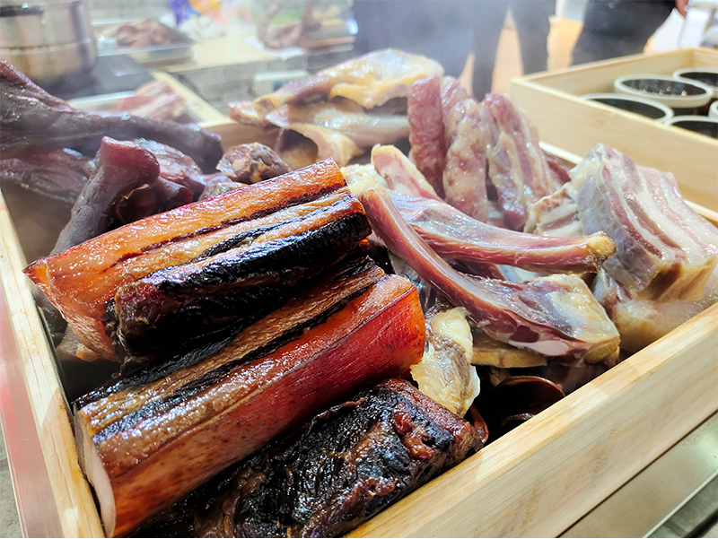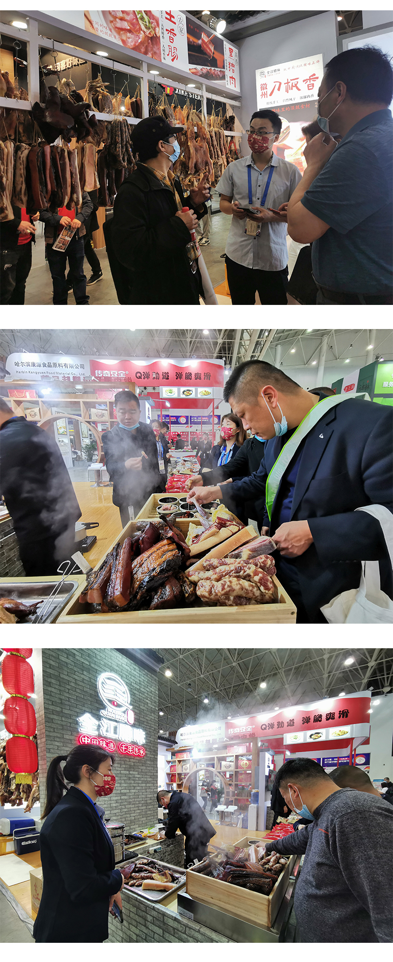 傳統(tǒng)的徽派馬頭墻、一層層懸掛著的徽州刀板香、土香腸、醬肉和風(fēng)干雞等產(chǎn)品,從視覺、嗅覺都讓參加展會(huì)的嘉賓和市民眼前一亮,現(xiàn)場(chǎng)蒸制的產(chǎn)品體驗(yàn)環(huán)節(jié),更是讓臘味展館前排起了長(zhǎng)隊(duì),全江臘味的徽派食材展廳成了本屆中國(guó)食材電商節(jié)的明星展廳。