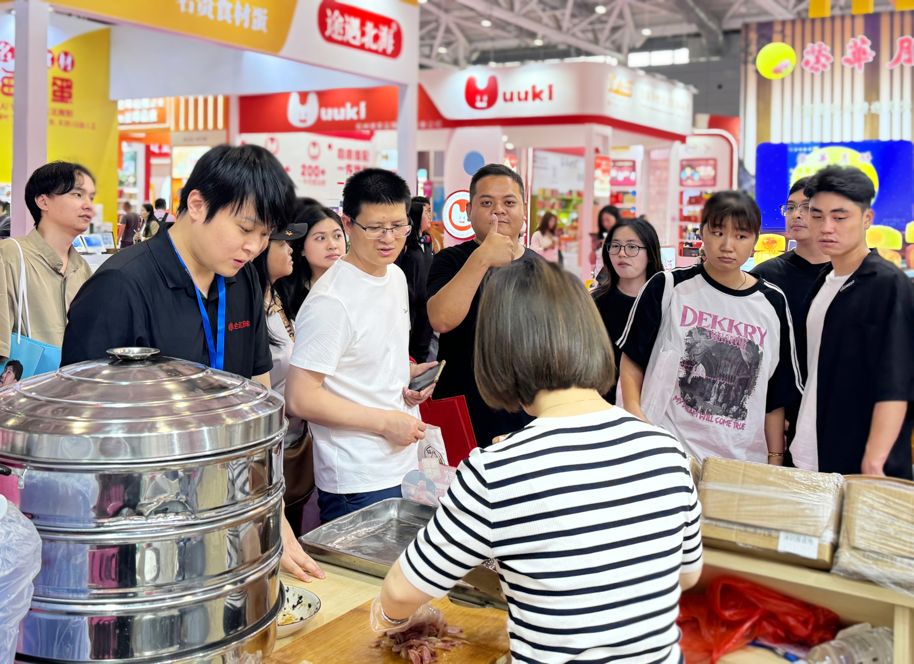 銷售人員熱情地為每一位駐足的參觀者細細介紹產(chǎn)品的文化?,F(xiàn)場還設置了試吃活動,讓人們在品嘗中感受徽派臘味的醇厚韻味,不少參觀者在品嘗后當場下單或咨詢合作事宜。