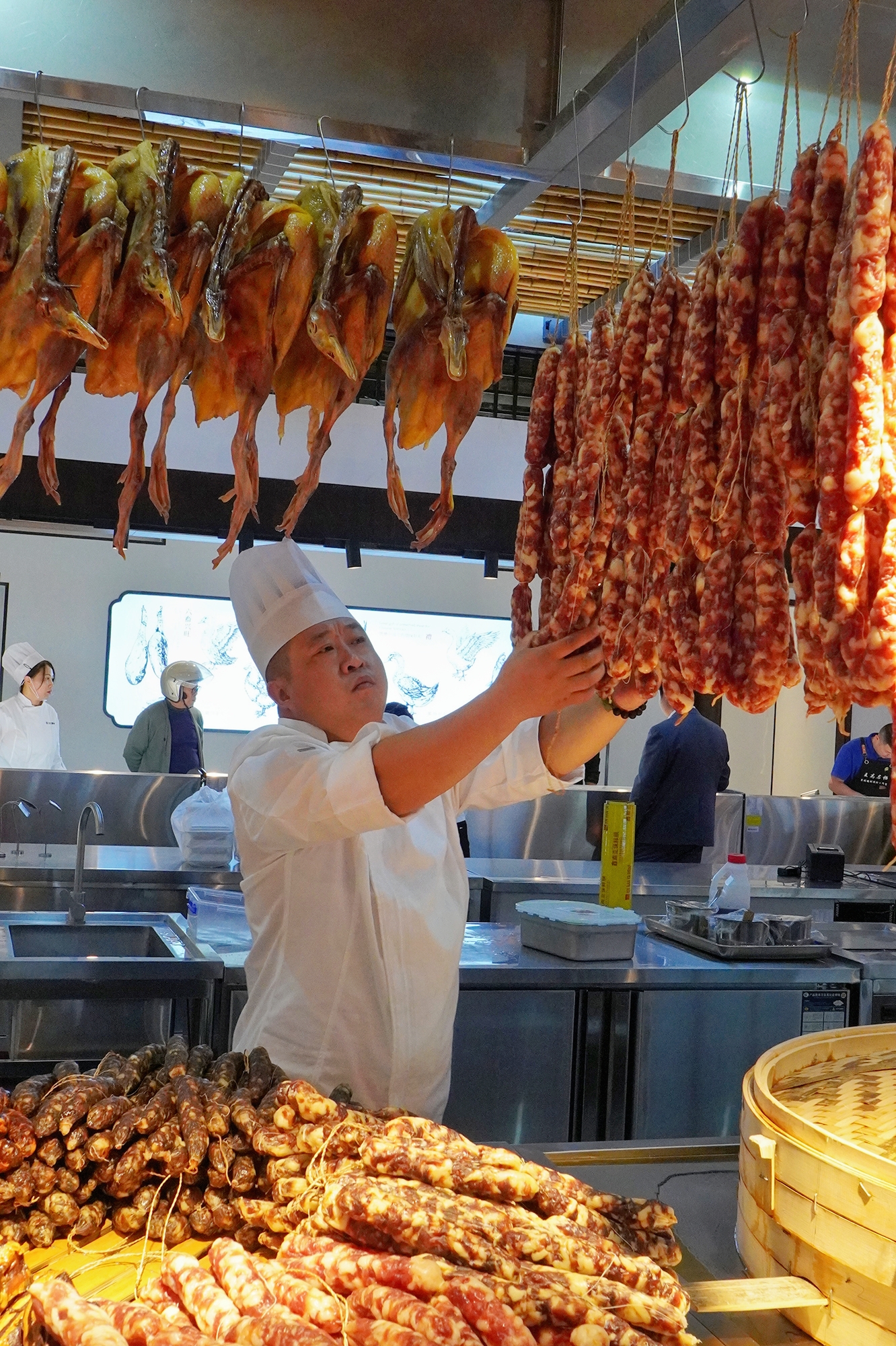 一掛掛油亮亮的臘味產(chǎn)品,如同時間的佳釀,不僅展示著季節(jié)更迭的故事,更承載著世代相傳的手藝與智慧。它們整齊排列,色澤誘人,表面泛著健康油脂的光澤,在柔和而恰到好處的燈光下,更添了幾分溫馨與誘惑,讓你沉浸在濃厚的臘味文化氛圍里。